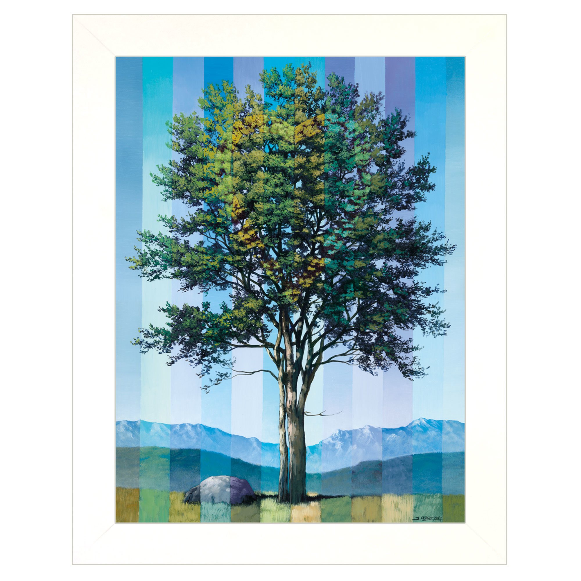 "When Love Grows" by artist Tim Gagnon. This decorative white framed print 15"x19" of unique format: vertical striped background of soft pastel colors of blues, lavenders and teals; fore-ground is striped in greens/brown pastels with a tree blended with the stripes. Framed print has a UV coating (glass is not needed) and arrives ready to hang.•TEXTURED ARTWORK with a 'rolled on' acid-free acrylic coating to create a canvas painting effect.•UV PROTECTANT COATING protects artwork from fading. No glass is necessary.• MOULDING adds natural beauty to the framed art. Frame is keyholed for the easy hanging.•THIS FINE HOME DECOR piece made in the USA by Woman Owned Business (WBE) is a perfect gift for a friend or relative.